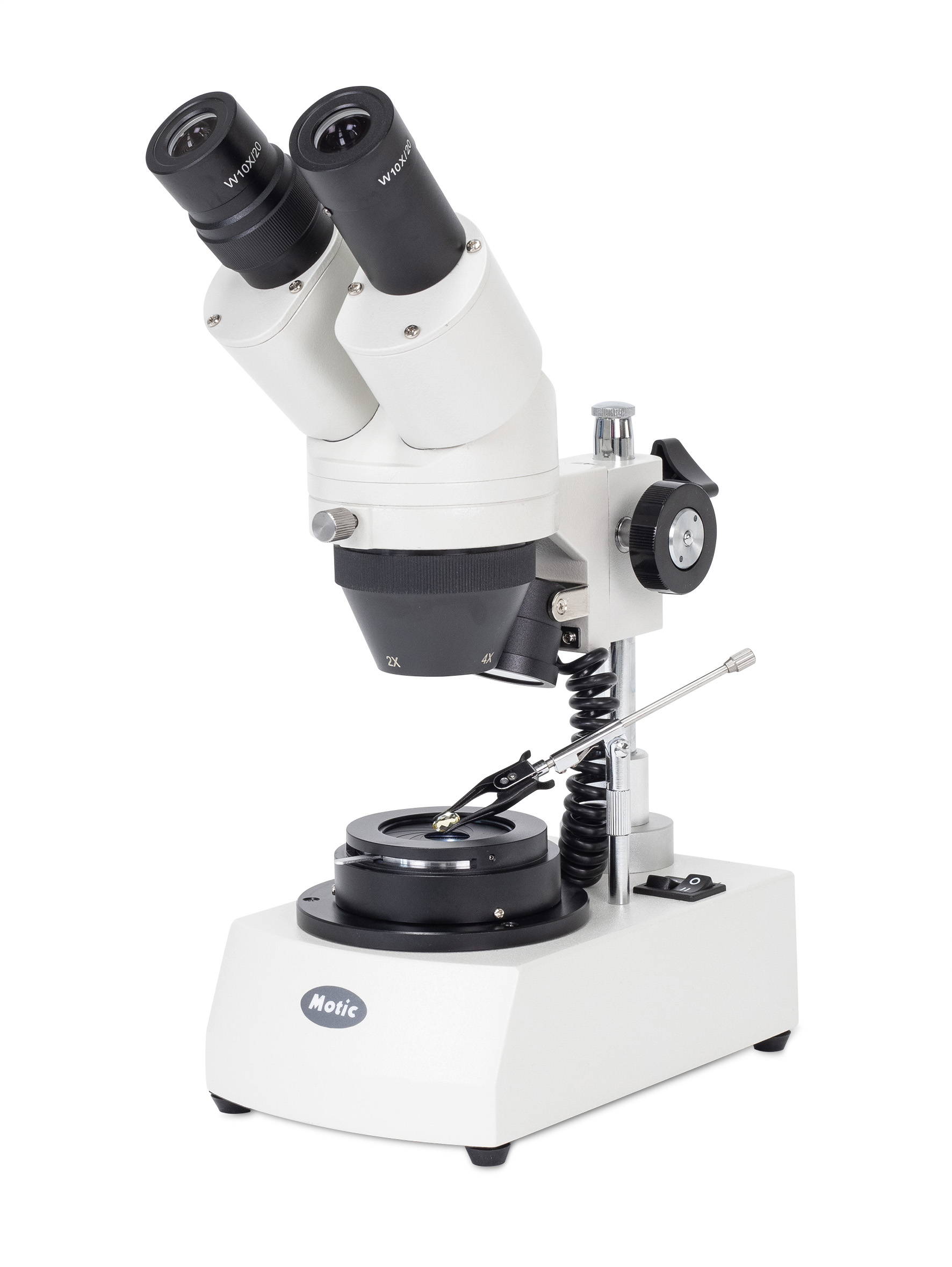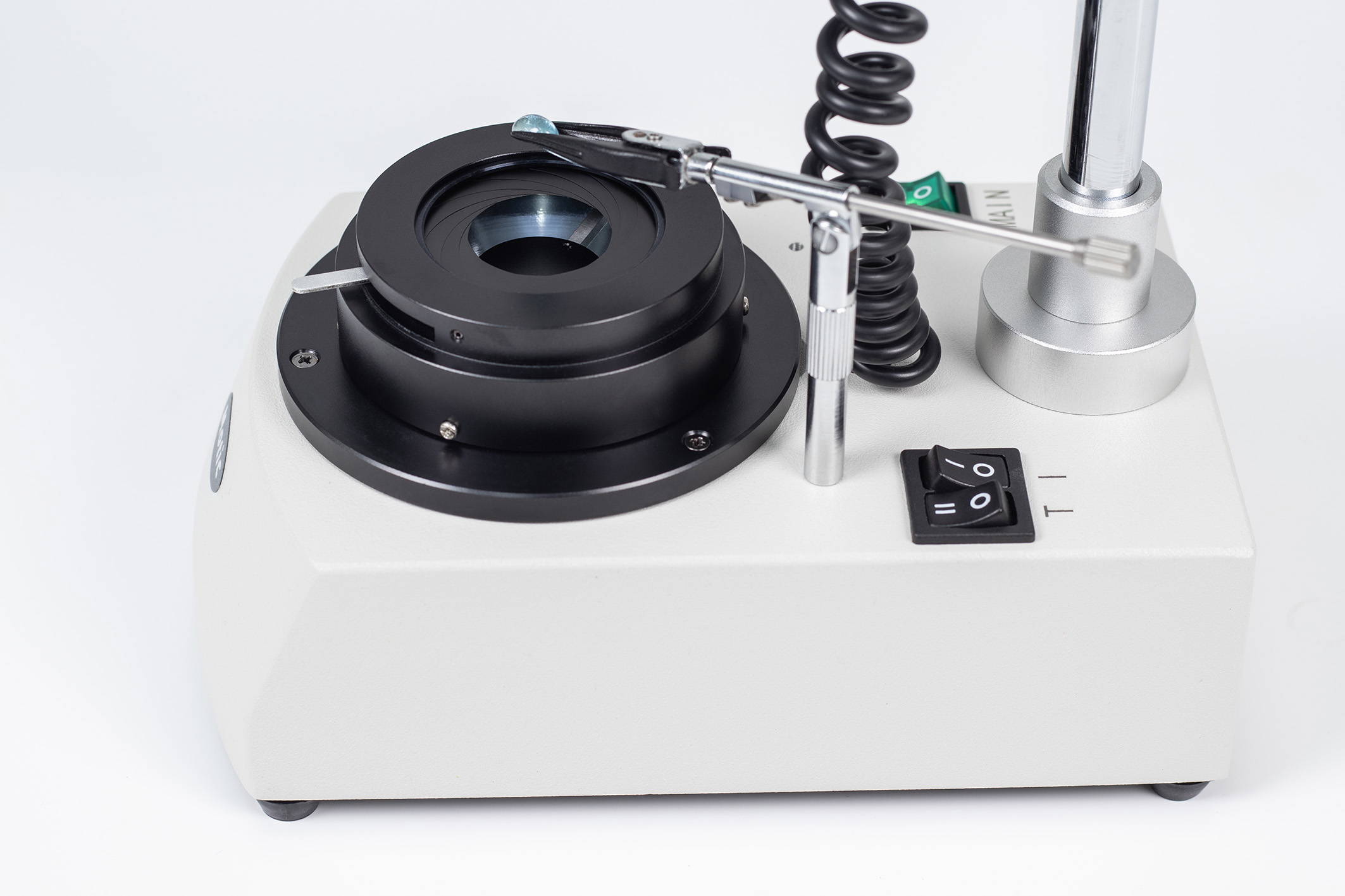 This compact stereomicroscope is configured for gemstone analysis, equipped with a darkfield insert and iris diaphragm to enhance contrast when viewing transparent specimens. It features 2X and 4X turret magnification options, a 47mm working distance, and cordless LED illumination. This stereomicroscope runs on a rechargeable battery, providing approximately 8 hours of autonomy. With a small footprint, 360ΒΊ rotatable head, and sturdy metal construction, it offers both flexibility and durability. Compatible with a range of accessories, including polarization tools, the ST-36C-DF provides an affordable solution for gemmologist